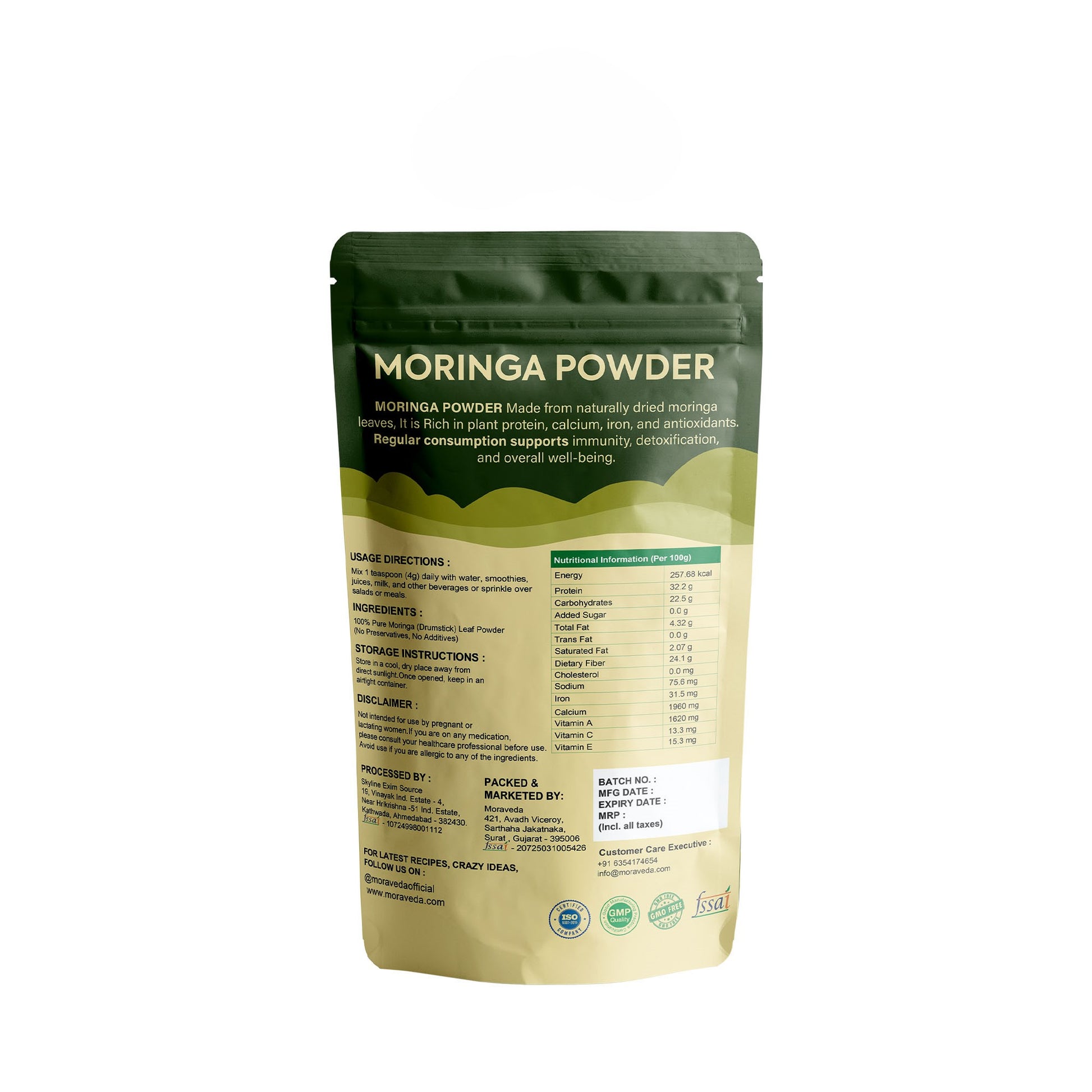 No preservatives, no additives, no fillers — just pure moringa powder.